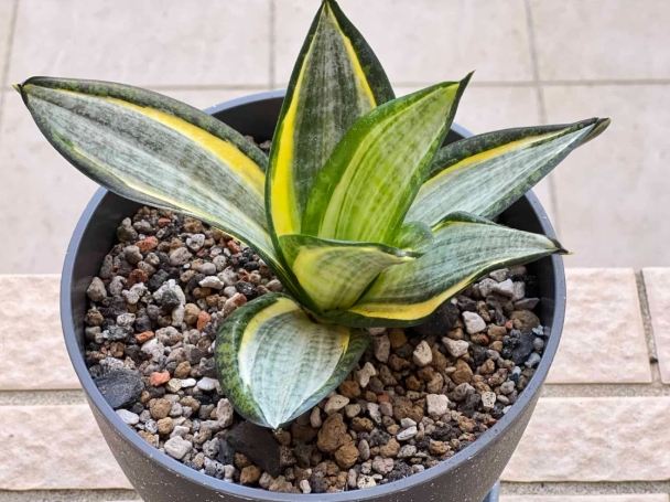 金邊虎尾蘭 (Sansevieria trifasciata 'Laurentii') 葉緣有明顯的金黃色邊條。 ⭐⭐⭐ (中等) 側芽分離葉插 側芽分株才能保有金邊,葉插後代會"退金"變全綠!(重要)