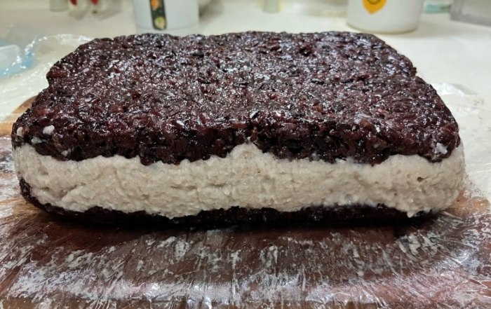 - 關鍵冷卻: 蒸好後,小心地把模具從蒸鍋裡拿出來(超燙!用隔熱手套)。千萬不要急著脫模! 剛蒸好的糕體非常軟嫩脆弱。把它放在室溫下,讓它 「完全冷卻」。至少放個3-4小時,甚至放到隔夜都沒問題。這個冷卻的過程會讓糕體持續定型,變得更紮實、更有彈性。相信我,熱熱的切絕對會碎到你懷疑人生!我有一次太心急,只放涼1小時就切,結果變成一盤紫米芋頭「屑」...慘不忍睹。冷卻時不用蓋蓋子,讓表面水分稍微散失一點更好。
